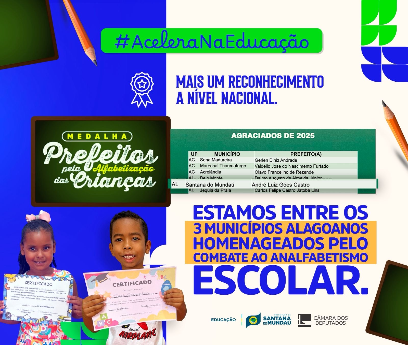 Em mais uma conquista a nível nacional que atesta o brilhante trabalho desenvolvido pelo município de Santana do Mundaú na educação, nesta quarta-feira (17), em uma solenidade realizada no plenário da Câmara dos Deputados, em Brasília, o prefeito André Castro foi homenageado com a Medalha ‘Prefeitos pela Alfabetização das Crianças’.