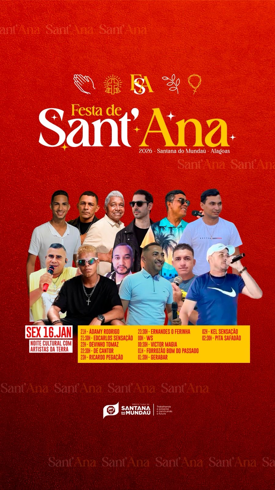 “Sempre começando o ano de modo muito especial, estamos vivenciando mais uma celebração da Festa de Sant’Ana. Momentos importantes de fé, devoção e, também, de muita música e alegria. Preparamos uma super programação para celebrar este período tradicional, que também aquece a nossa economia e movimenta toda a cidade. Estão todos convidados”, disse o prefeito André Castro.