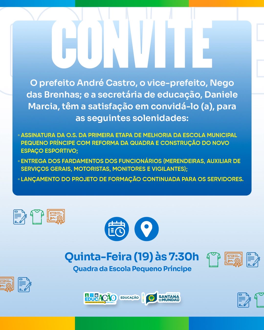Além disso, o gestor realizará o Lançamento do Projeto de Formação Continuada para os Servidores e a entrega de fardamentos para as merendeiras, auxiliar de serviços gerais, motoristas, monitores e vigilantes.